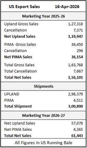 Net sales of Pima totaling 36,200 RB for 2025/2026--a marketing-year high-- were up noticeably from the previous week and from the prior 4-week average.